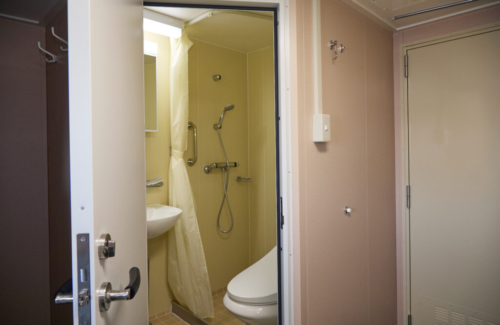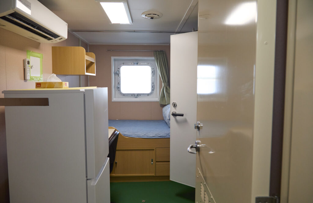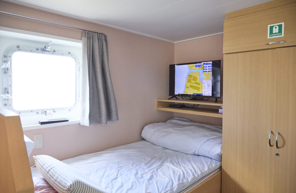 今後、男性だけでなく女性乗組員も乗船できるように内装を工夫。共用浴室のほかに、シャワートイレ付個室を3部屋設置しました。さらに、個室の面積を広げ、Wi-Fi・冷蔵庫・テレビ・洗面所を完備。乗組員が快適に過ごせる船にすることで、働きやすい職場づくりにつなげています。